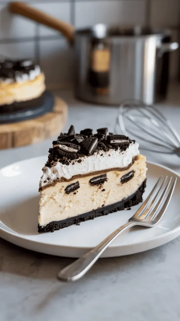 • A beautiful slice of the Oreo cheesecake on a dessert plate, fork beside it, garnished with whipped cream and Oreo crumbs. Bright, airy lighting with a lightly blurred kitchen background for a fresh, homey vibe.
