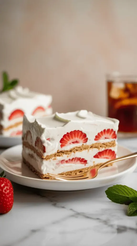 • A beautifully plated slice of the icebox cake on a white dessert plate, with a fork beside it. The cake slice shows clear layers of graham crackers, cream, and strawberries, garnished with a fresh mint sprig and dusting of powdered sugar.