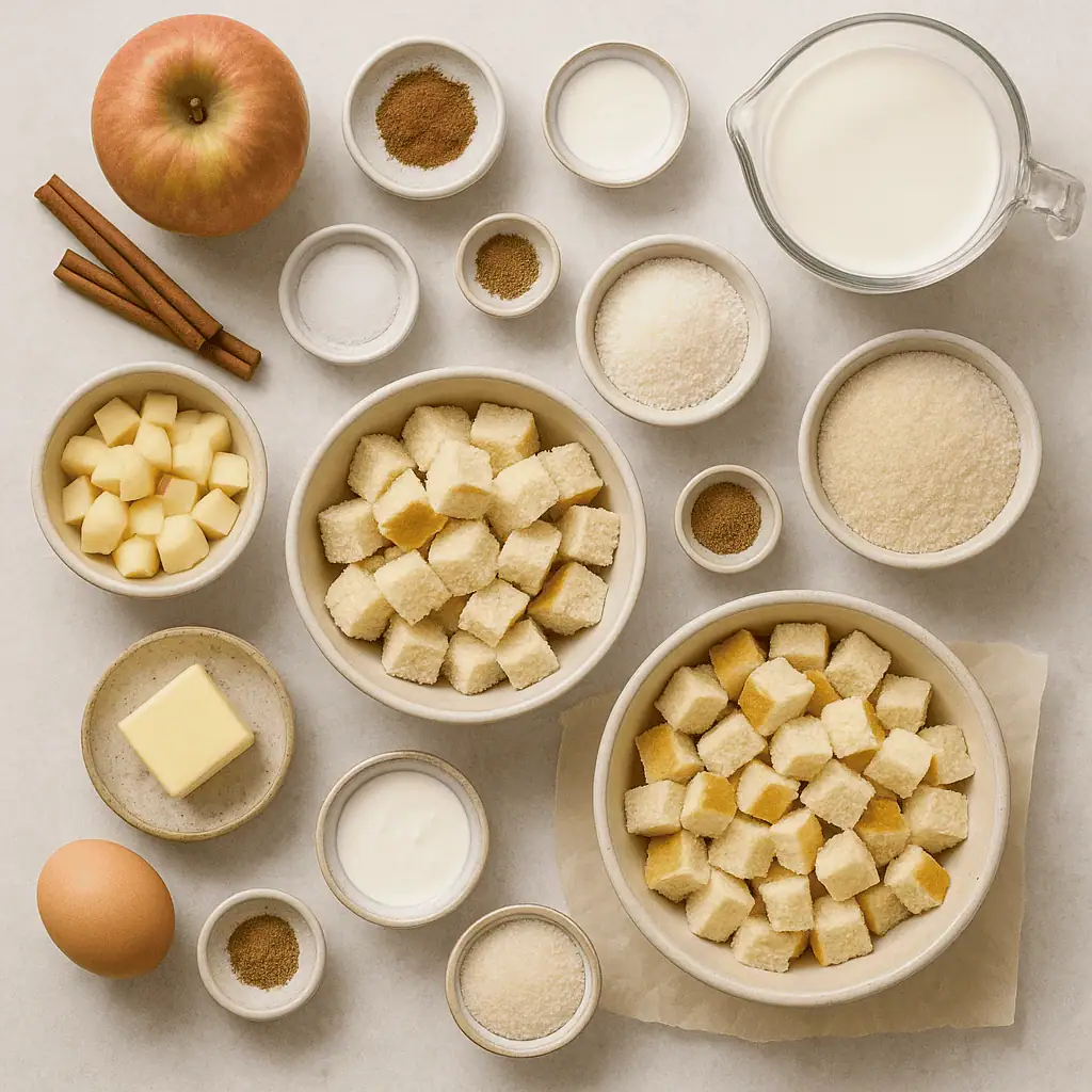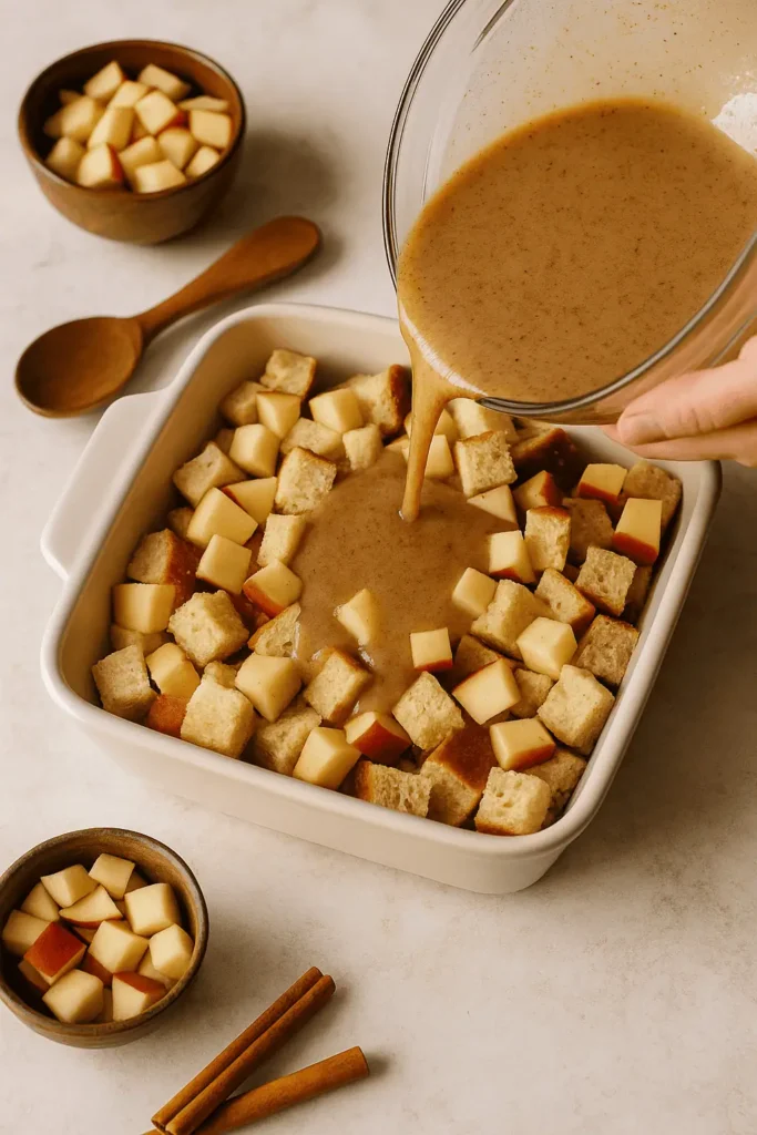 - Assemble: Add bread cubes and apples to dish. In a bowl, whisk eggs, milk, cream, sugar, spices, salt, and vanilla. Pour evenly over bread.
