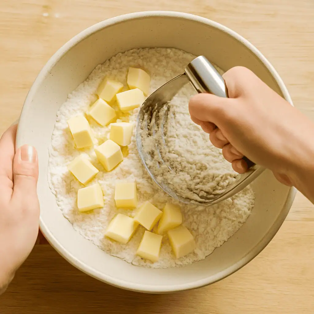 - Make the crust: In a bowl, mix flour, sugar, and salt. Cut in butter until crumbly. Add ice water one tbsp at a time just until dough holds together. Flatten into a disk, wrap, and chill 30+ minutes.