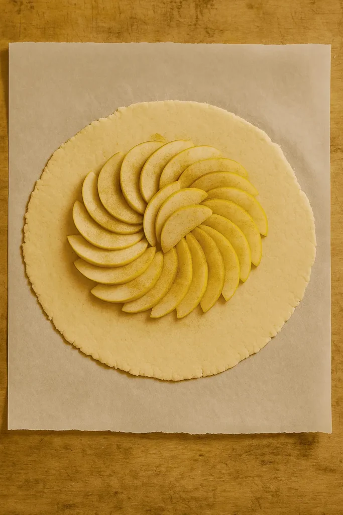 - Assemble: Arrange apples in the center, leaving a 2-inch border. Fold edges over, pleating as you go.