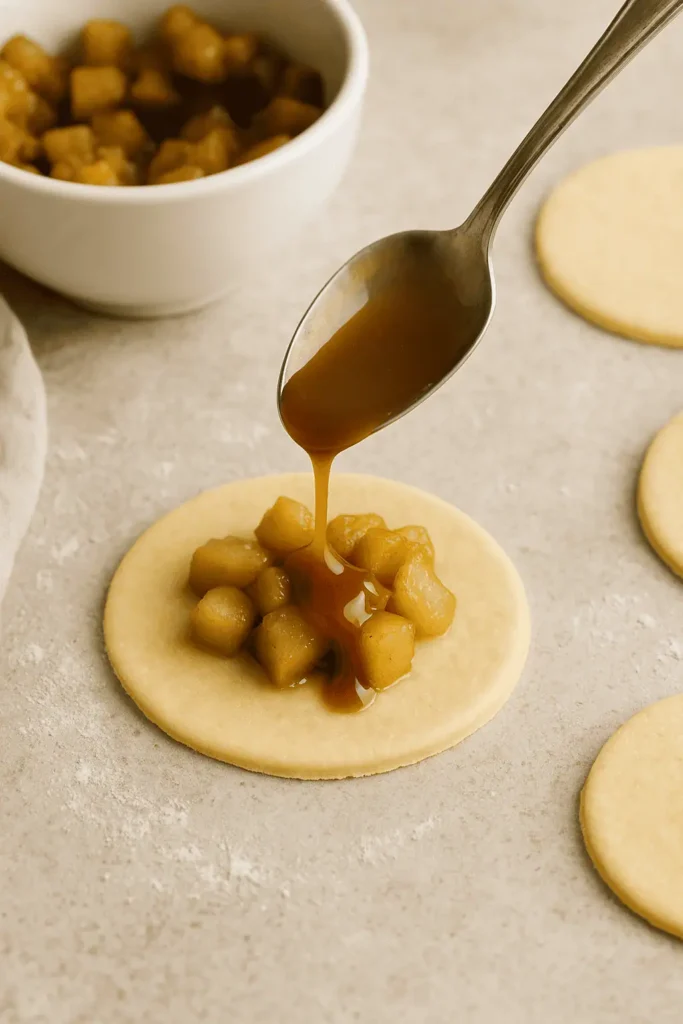 4. Assemble the pies: Roll out dough to 1/8-inch thick. Cut into 4-inch rounds. Spoon apple filling in center, add caramel drizzle, and top with another dough round. Crimp edges with a fork.