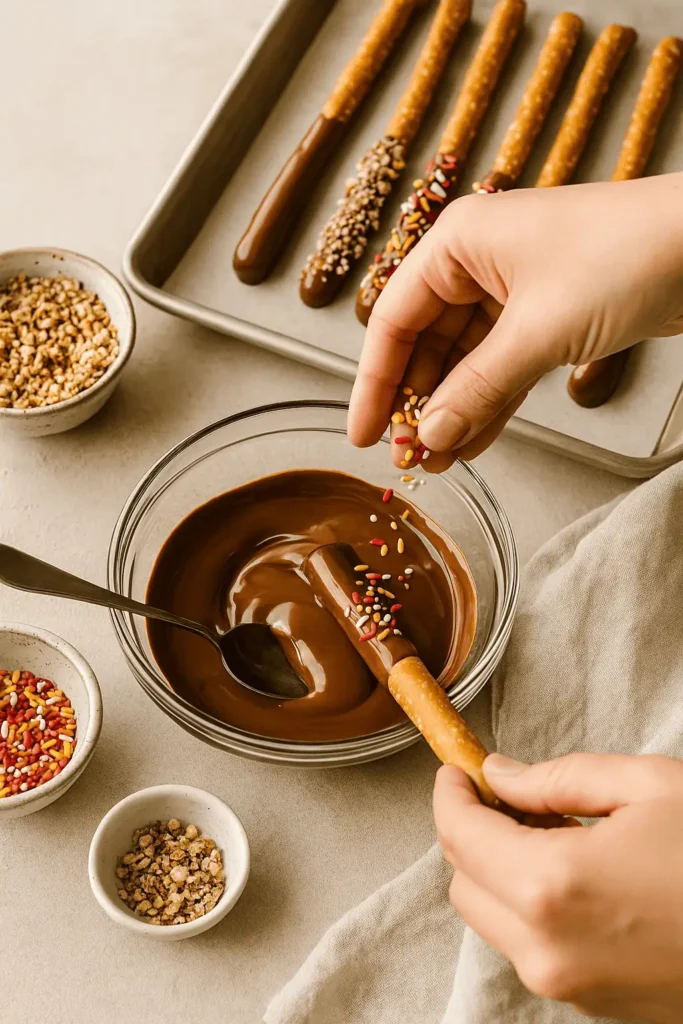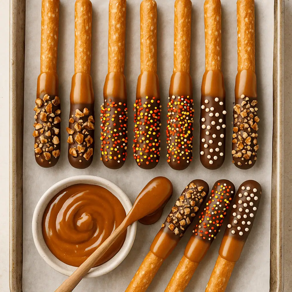 Imagine: crisp, salty pretzel rods wrapped in chewy golden caramel, then dipped in chocolate and dressed up with sprinkles, crushed nuts, or a drizzle of white chocolate. Itβs the kind of snack you make once… and then every week forever.