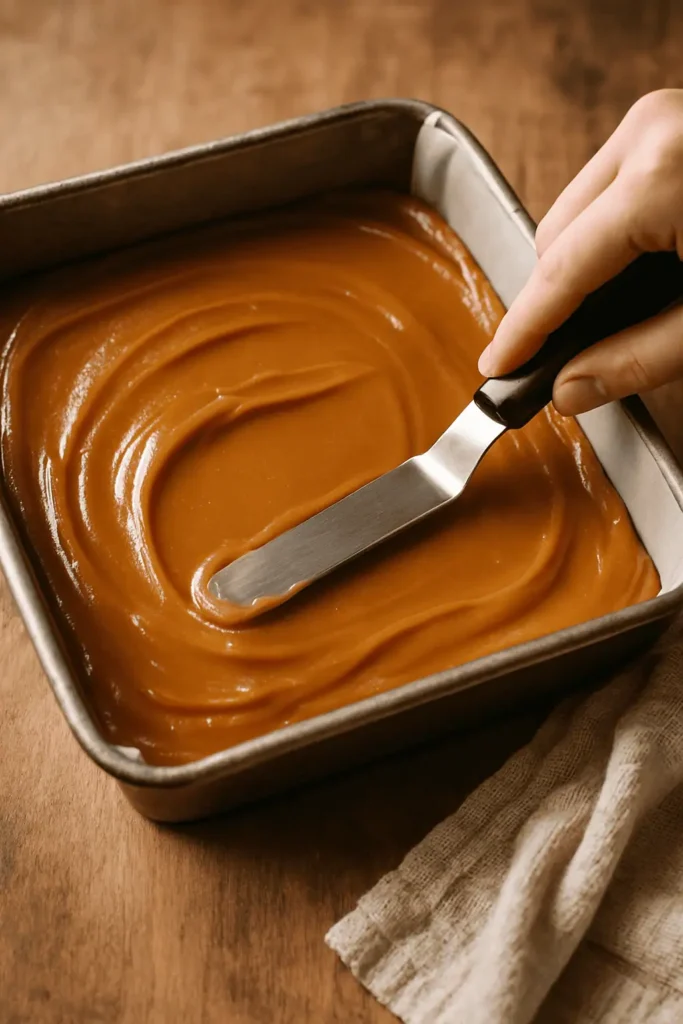 3. Make the Caramel: In a heavy saucepan, combine butter, brown sugar, corn syrup, and sweetened condensed milk. Cook over medium heat, stirring constantly until mixture boils. Continue stirring 5-7 minutes until thickened and golden (soft ball stage, 235°F). Remove from heat and stir in salt and vanilla.