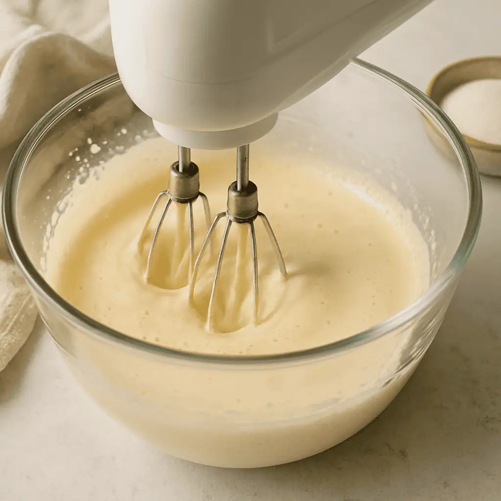 - Beat eggs, sugar, and vanilla with a mixer for 5 minutes until thick and pale.