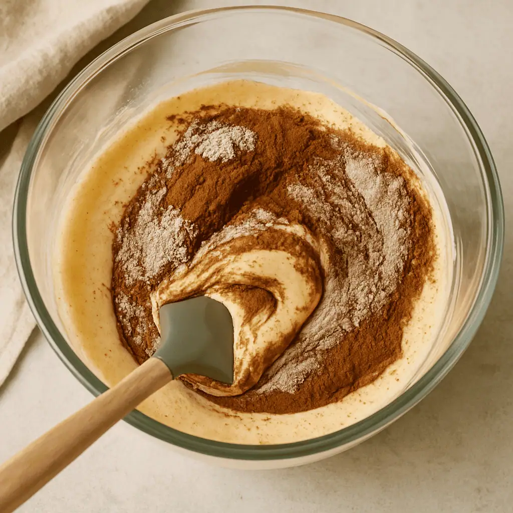 3. Sift flour, cocoa, baking powder, and salt into the egg mixture. Fold gently to keep volume.