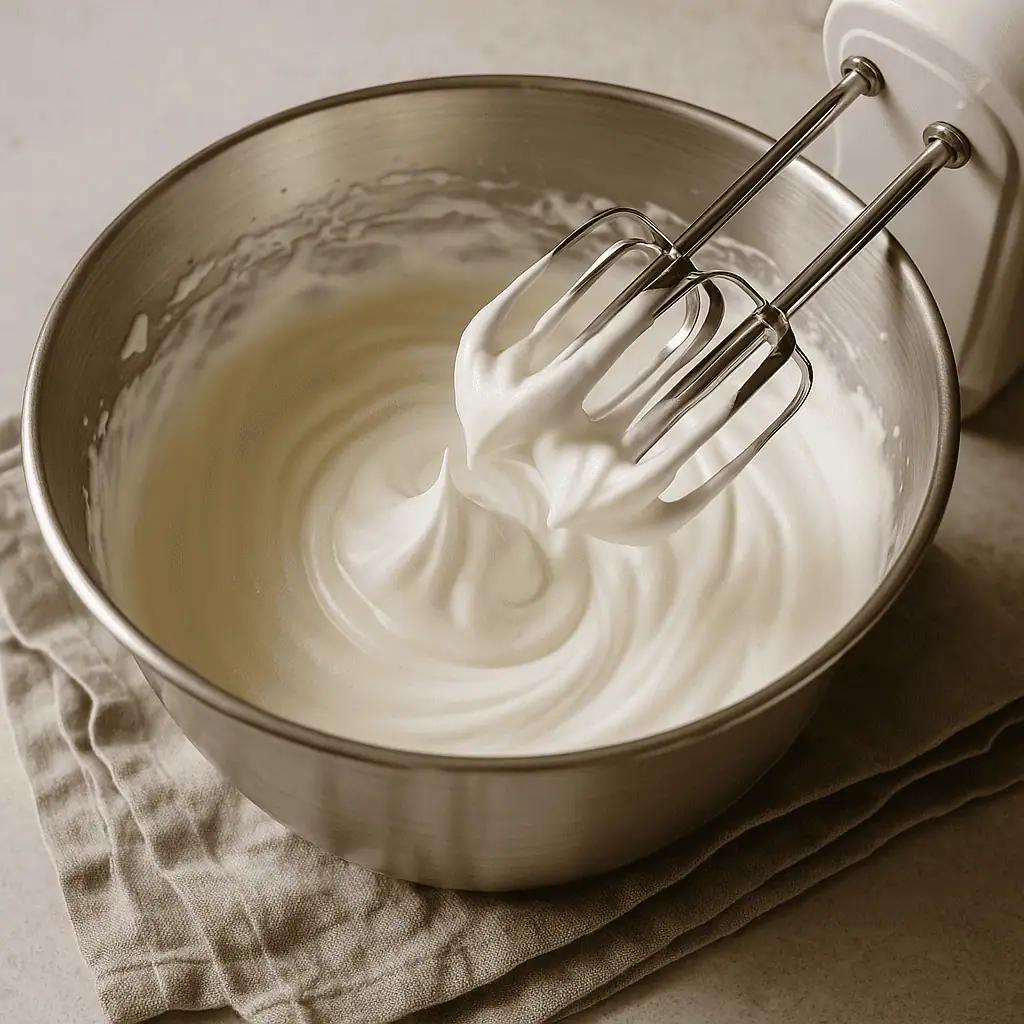 7. Whip cream, sugar, and vanilla to stiff peaks. Unroll cake, spread filling evenly, then re-roll (without towel).