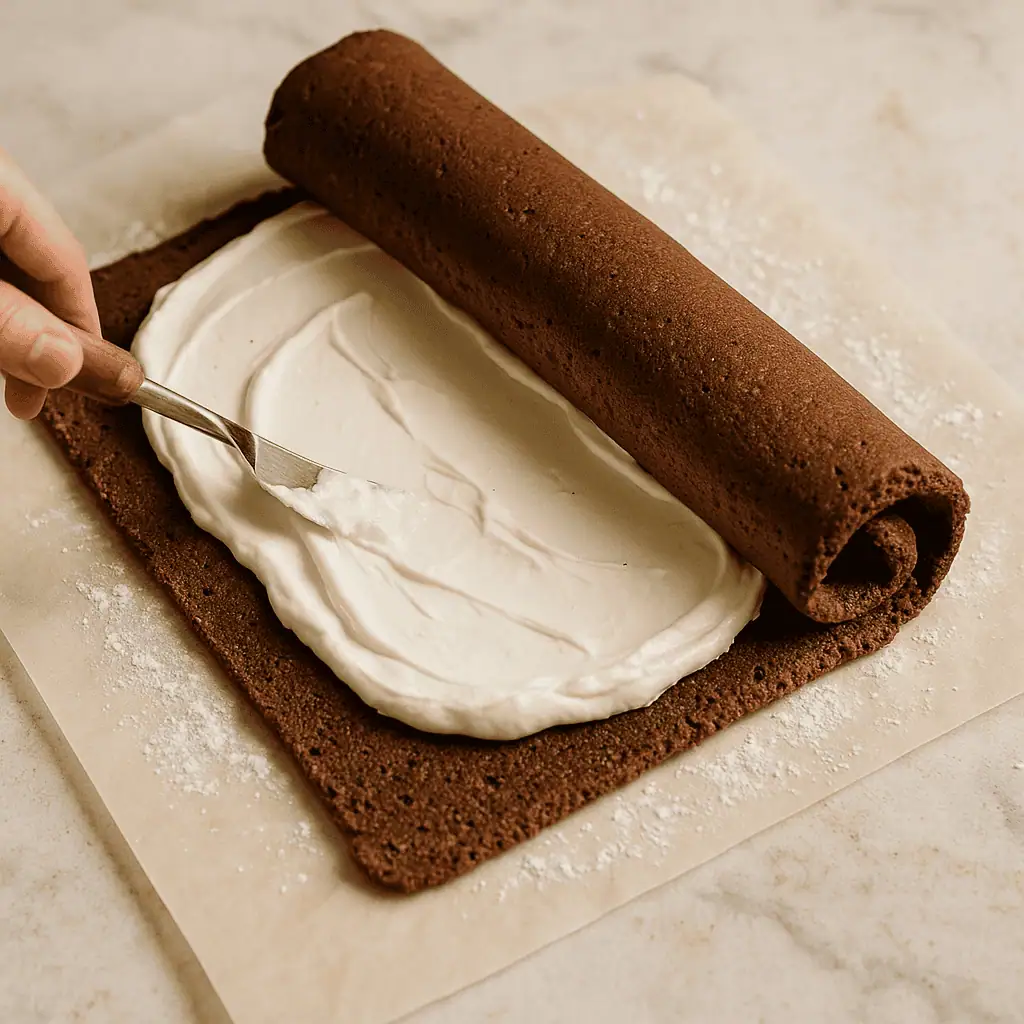 - Whip cream, sugar, and vanilla to stiff peaks. Unroll cake, spread filling evenly, then re-roll (without towel).