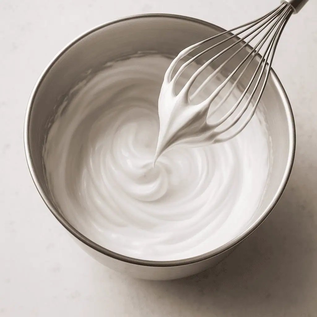 - 3️⃣ Increase speed to high and gradually add sugar, 1 tablespoon at a time. Beat until stiff, glossy peaks form and sugar is fully dissolved (rub a bit between your fingers — it should feel smooth).