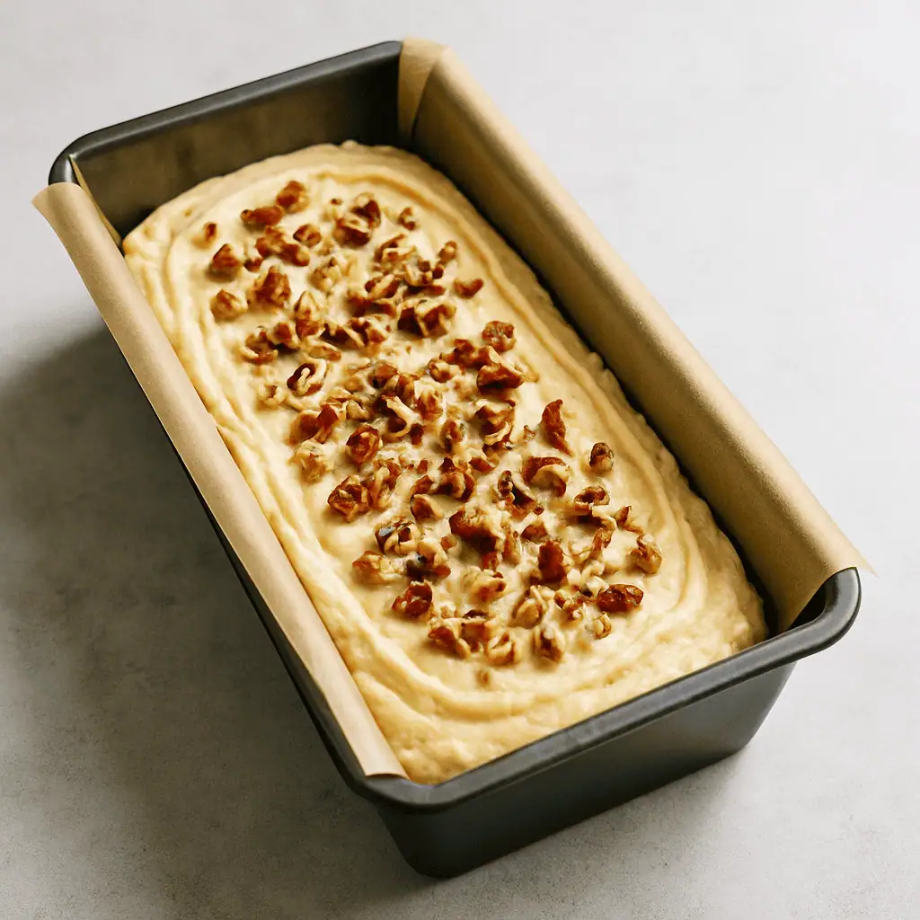 - Prep: Preheat oven to 325°F. Grease a 9×5″ loaf pan and line with parchment.