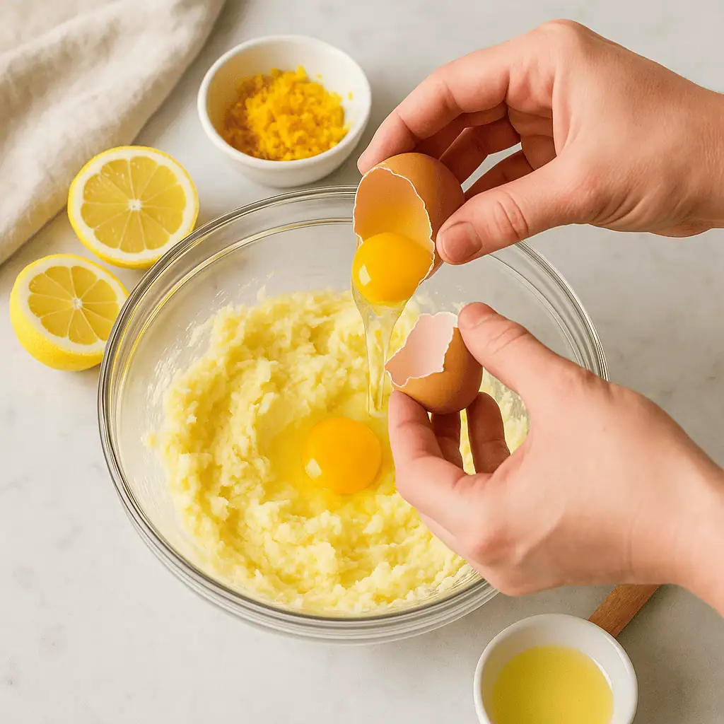 - Add eggs, lemon zest, juice, and vanilla.