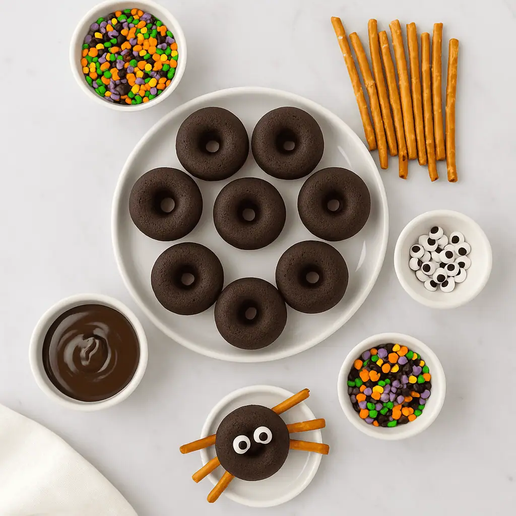 These Mini Spider Donuts are the ultimate no-bake Halloween dessert—adorable, spooky, and ready in minutes. Chocolate mini donuts become creepy-cute spiders with pretzel stick legs and candy eyes. Perfect for Halloween parties, school treats, or edible holiday décor. 🕷🍩