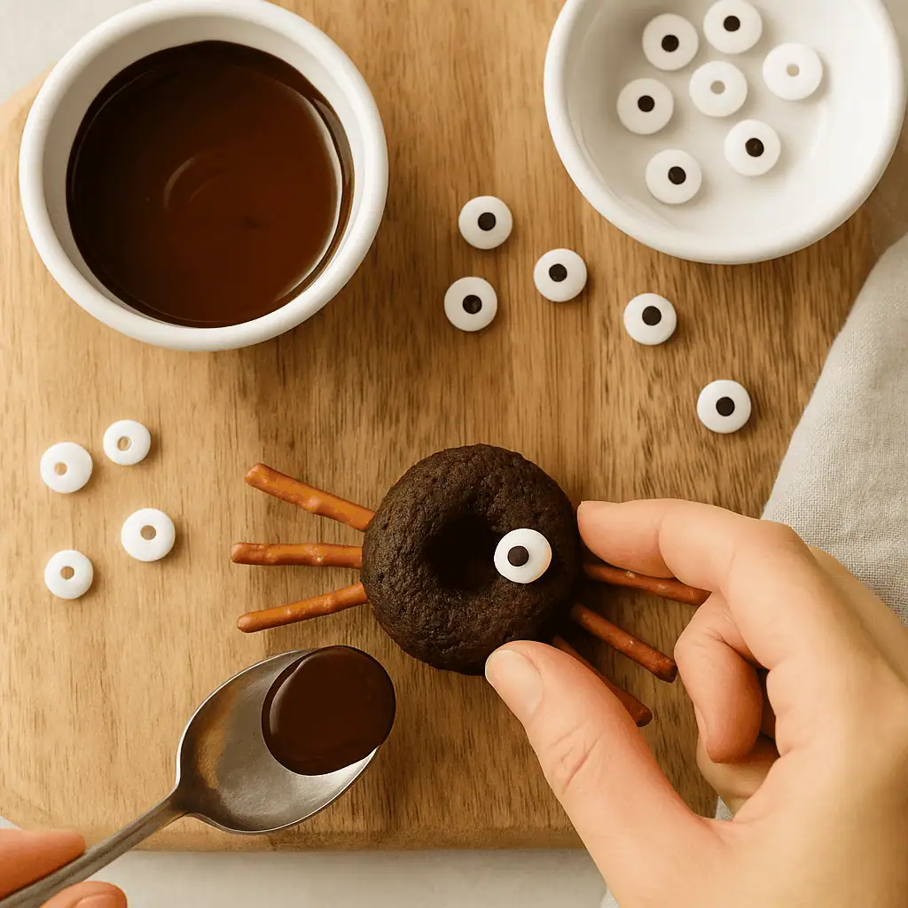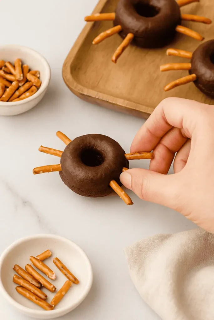 - Add legs: Break pretzel sticks in half. Insert 4 on each side of the donut to make spider legs.