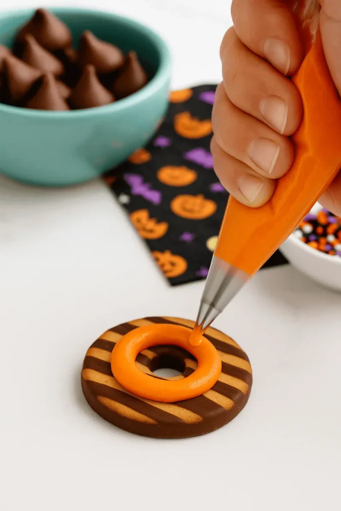 2. Add frosting: Pipe or dab a small ring of frosting around the center hole on the bottom (chocolate side) of each cookie.