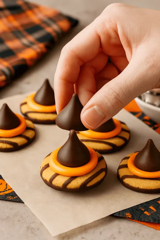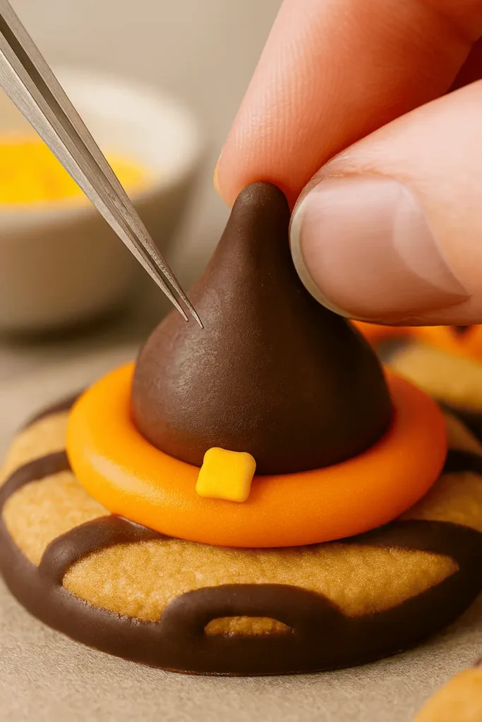 3. Attach the kiss: Press a chocolate kiss onto the frosting. It will form the pointed tip of the witch hat.