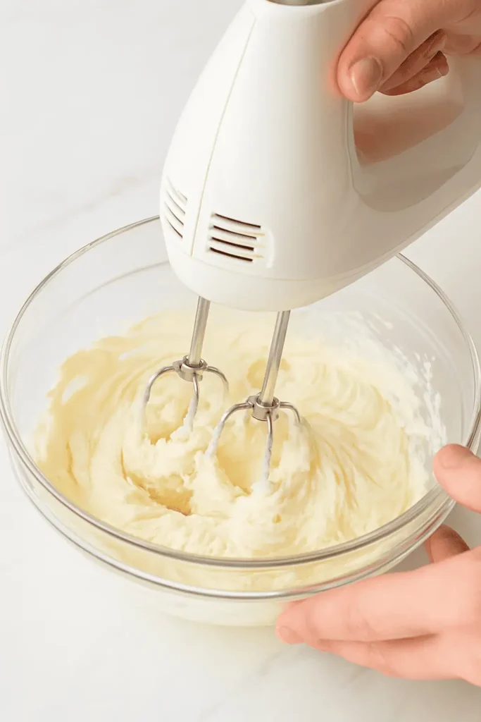 - Gently fold the whipped cream into the cream cheese mixture until fully combined and fluffy.