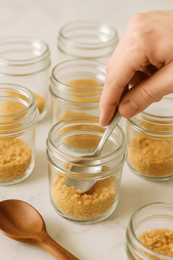 - Spoon 2 tablespoons of the crumb mixture into the bottom of each jar (about 6 jars) and gently press down to form a crust layer.