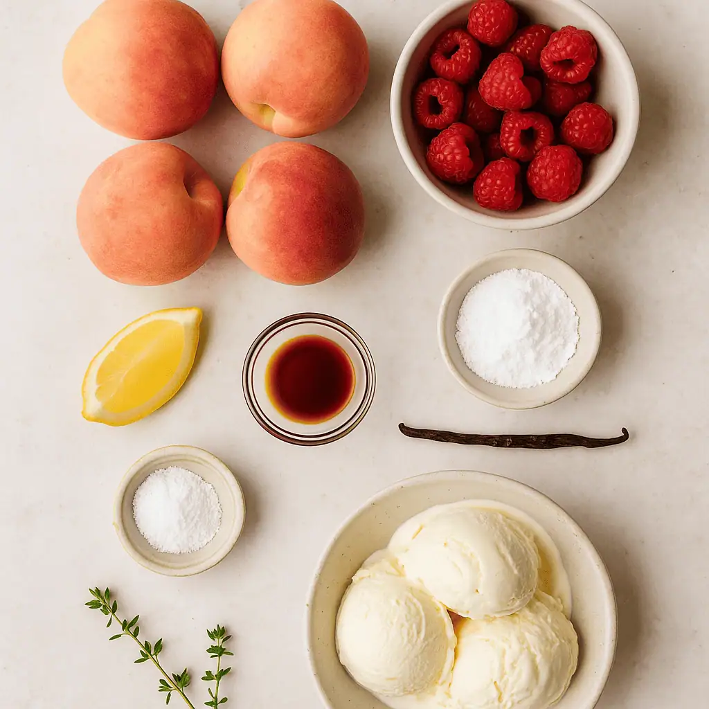 - Assemble: Place a scoop of vanilla ice cream in a dish. Top with peach halves and drizzle with raspberry sauce. Garnish if desired.