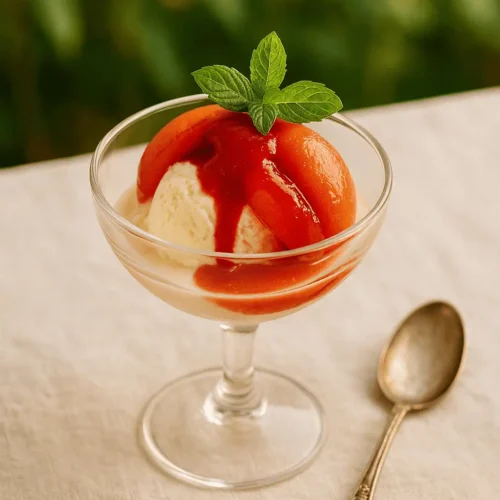 Imagine this: it’s golden hour, your table is set with chilled wine glasses, and dessert arrives in vintage coupe dishes. Peach Melba. The 1890s classic is back and she’s looking very good. We’re talking tender poached peaches, lush raspberry sauce, and dreamy vanilla ice cream. Elegant? Yes. Easy? Also yes.