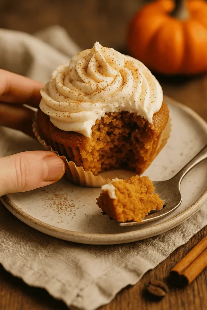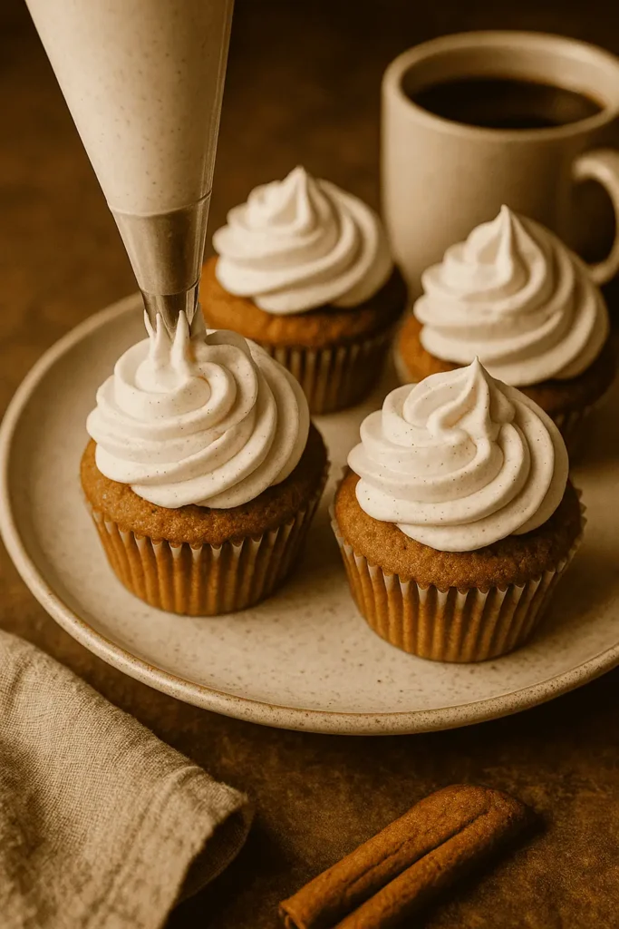 - Frosting: Whip the cream, powdered sugar, cinnamon, and vanilla to soft peaks. Pipe or spoon generously onto each cupcake.