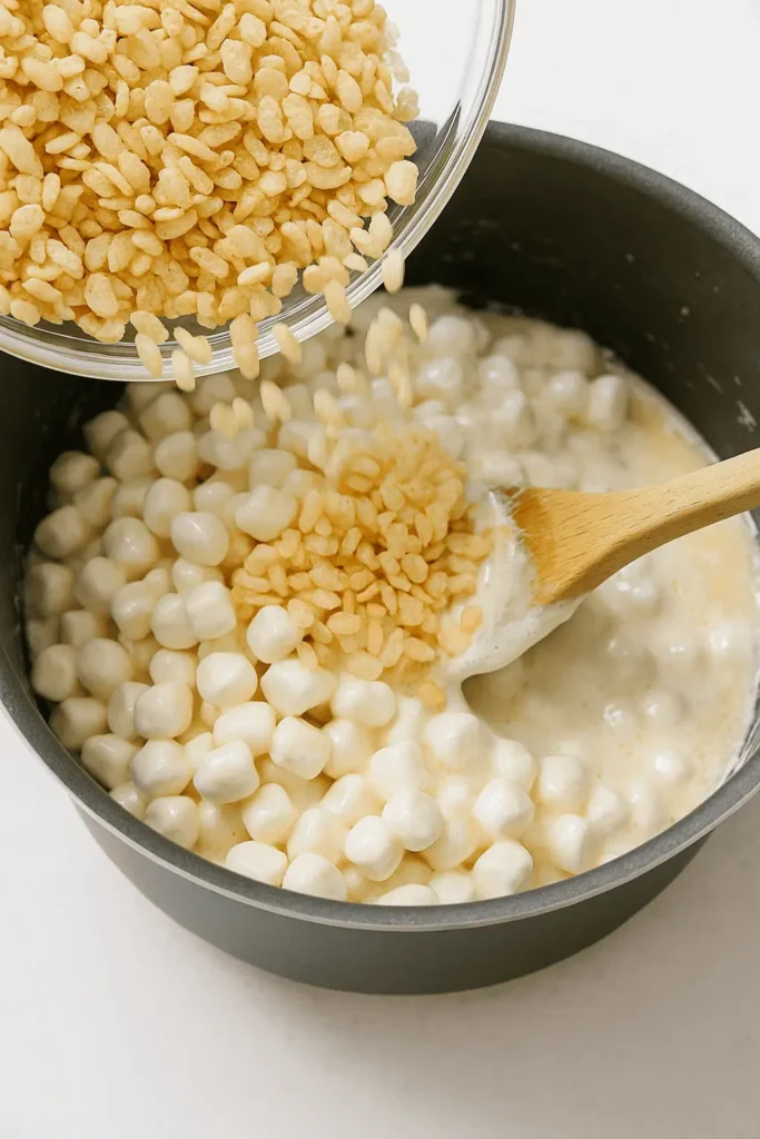 - Quickly add the Rice Krispies cereal and stir until all the cereal is evenly coated.