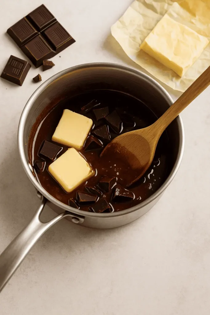 - Melt butter and chocolate: In a saucepan, melt butter and chocolate over low heat, stirring until smooth. Remove from heat and let cool slightly.