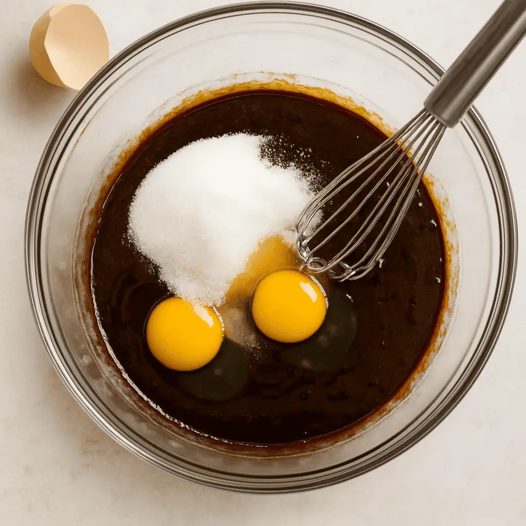 - Mix wet ingredients: Whisk in both sugars, then the eggs and vanilla.