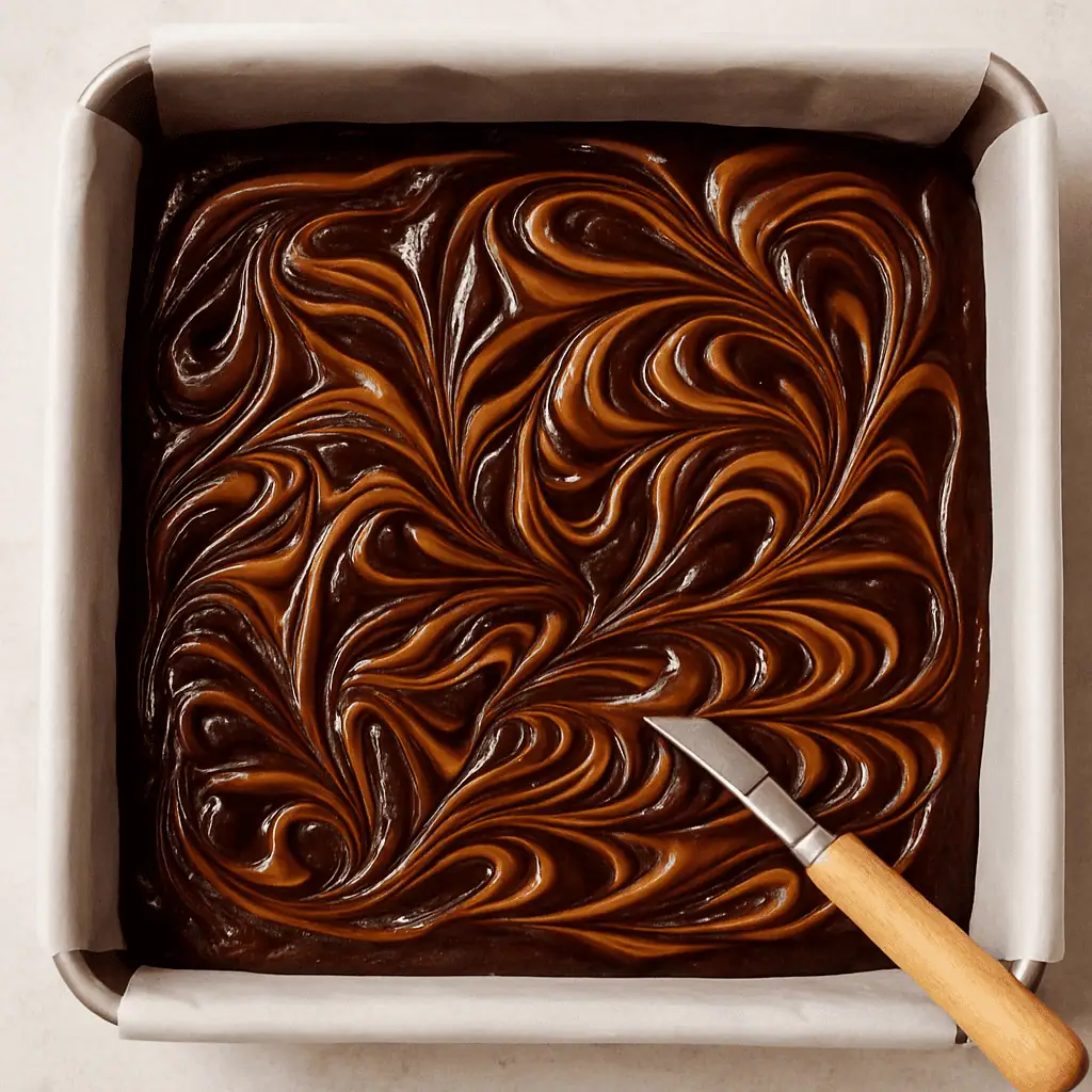 - Layer & swirl: Pour half the batter into the pan. Drizzle half the caramel over it. Add remaining batter, then swirl remaining caramel on top with a knife.