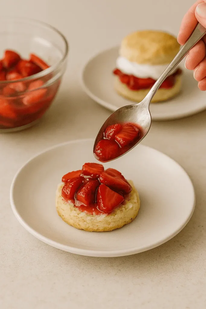 6. Assemble shortcakes: Split warm biscuits, spoon strawberries over the bottom half, top with whipped cream, and finish with the biscuit top. Serve immediately.