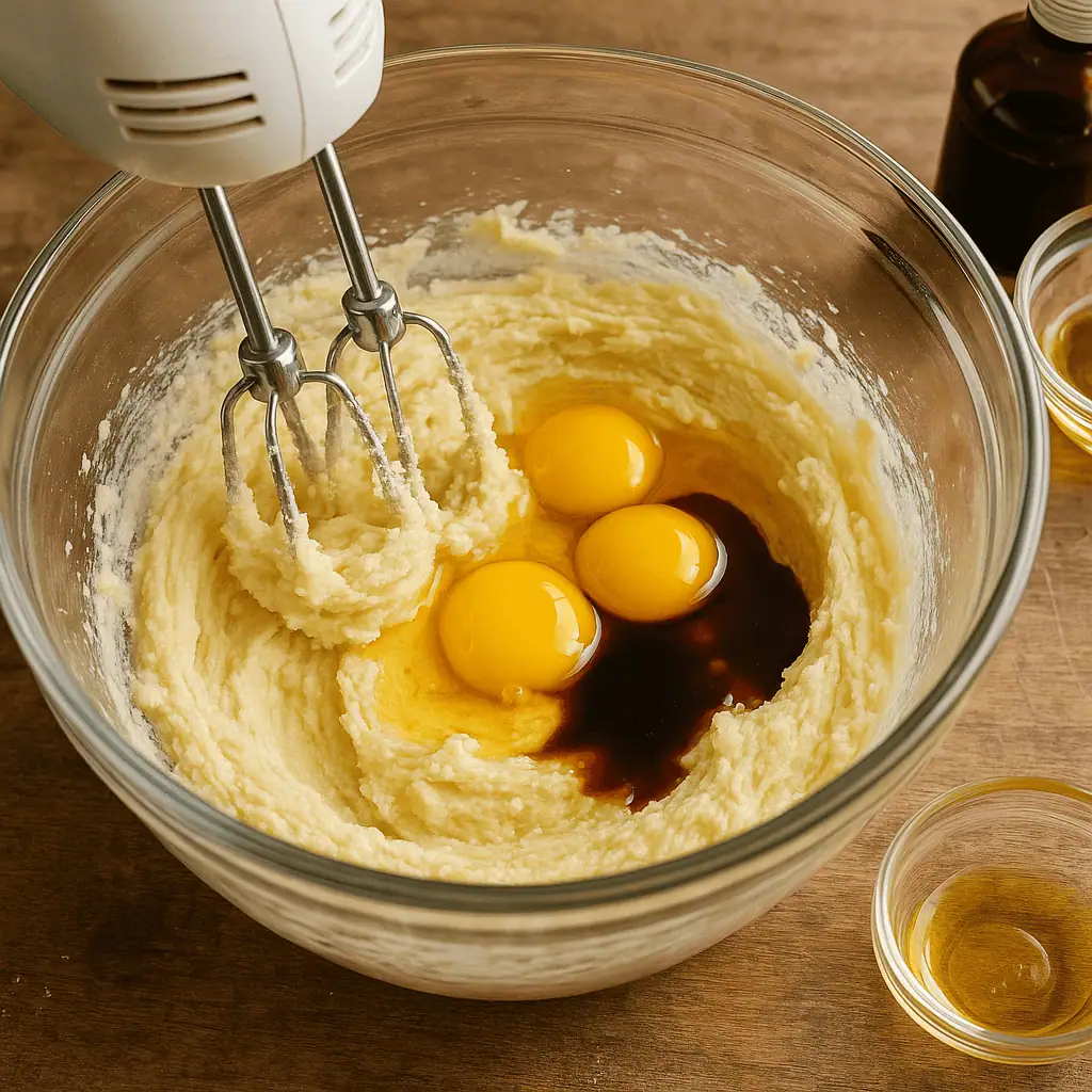 2. Add eggs, extra yolk, and vanilla. Mix until incorporated.