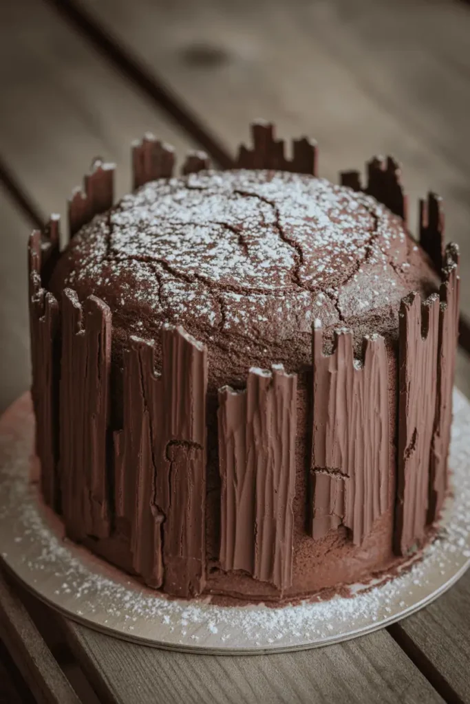 - Decorate: Spread ganache over cake, drag fork through to make bark texture. Chill to set.